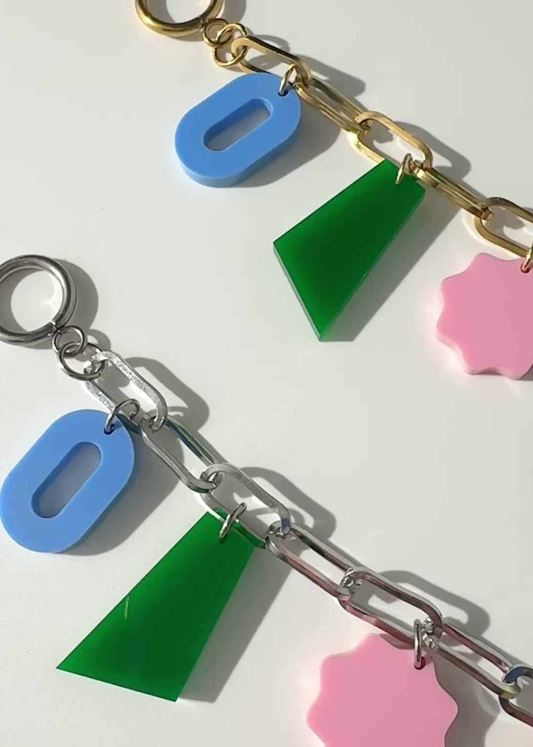 Materials: Gold or silver plated stainless steel bracelet + acrylic pieces